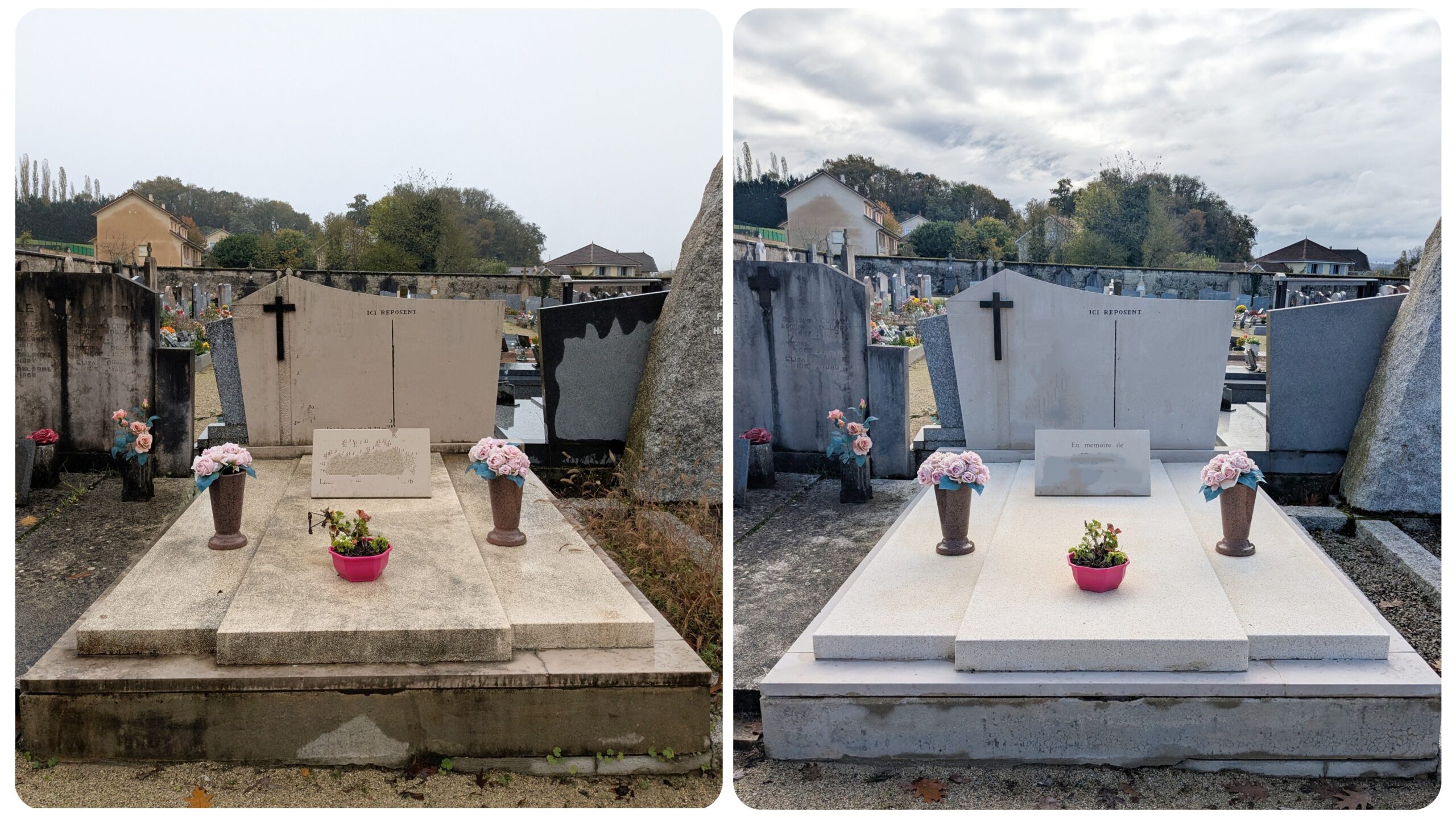 Lavage complet de la tombe à la main ou au nettoyeur haute pression (suivant l’état de la pierre)